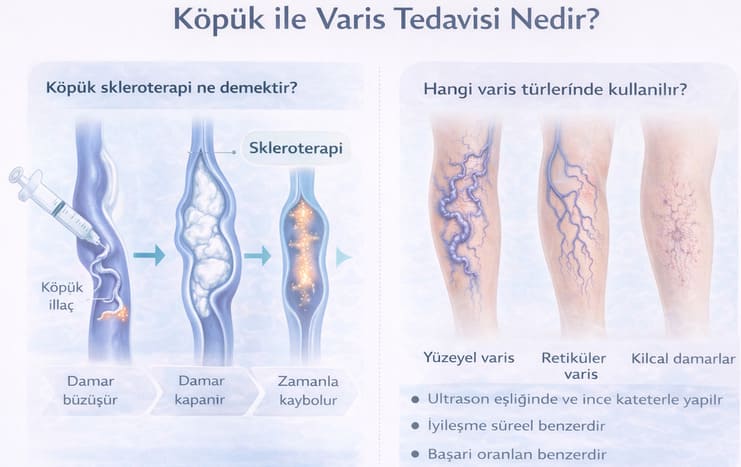 Köpük ile varis tedavisi özellikle orta ve küçük çaplı yüzeyel varislerde oldukça etkili bir yöntemdir. Bu damarlar genellikle bacakta dışarıdan görülebilen, kıvrımlı ve belirgin hale gelen toplardamarlardır.