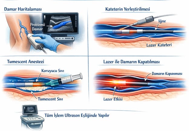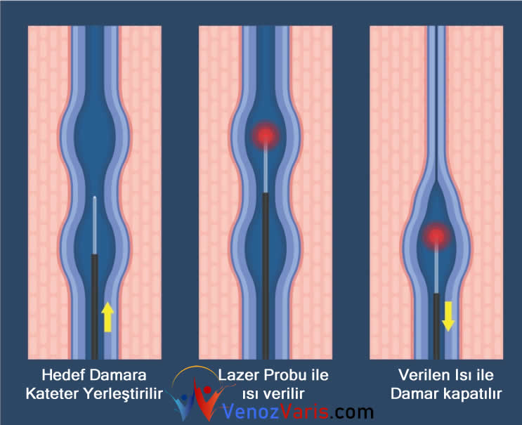 Lazer kateteri damar içine yerleştirildikten sonra verilen enerji damar duvarında ısı etkisi oluşturur. Bu ısı, damar duvarındaki proteinlerin büzüşmesine ve damarın içten kapanmasına yol açar.