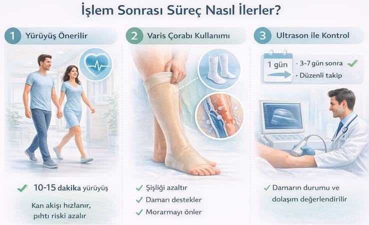 Birçok hastada işlem sonrası bir süre varis çorabı önerilir. Amaç dolaşımı desteklemek, şişliği azaltmak ve iyileşmeye katkı sağlamaktır.