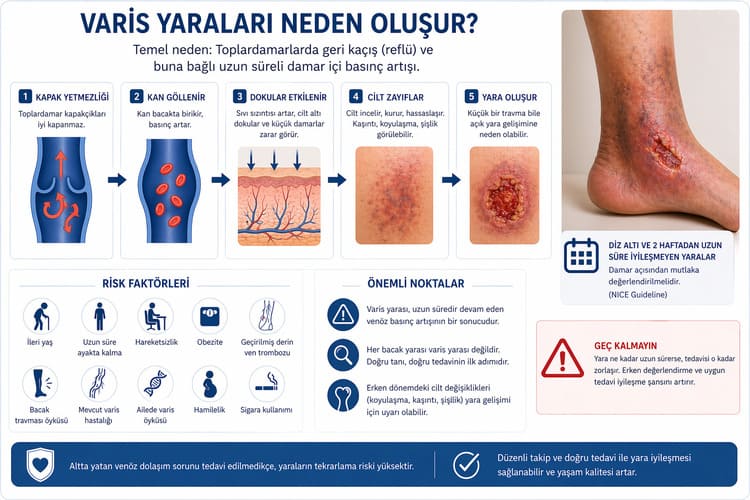Özetle varis yaraları, yalnızca ciltte açık bir alan olarak görülmemelidir. Yaranın kapanması için pansuman, kompresyon, hareket, cilt bakımı ve gerekirse venöz girişim aynı planın parçaları olabilir. Şikayet uzuyorsa, yara kapanmıyorsa veya tekrar ediyorsa, önce nedenini netleştirmek en doğru adımdır.