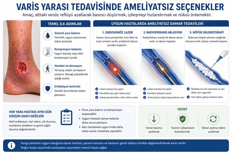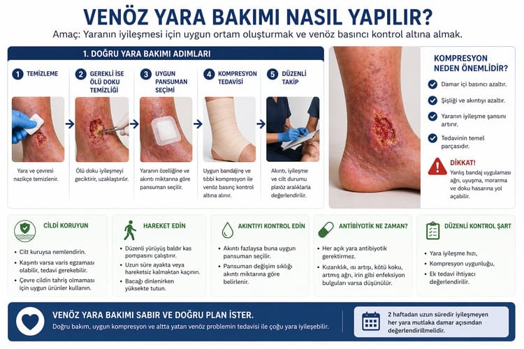 Yara bakımı tek başına çok değerlidir, ancak altta yatan venöz reflü devam ediyorsa iyileşme yavaşlayabilir veya yara tekrar açılabilir. Bu nedenle uygun hastalarda yalnızca pansuman değil, damar sorununa yönelik tedavi de gündeme gelir.
