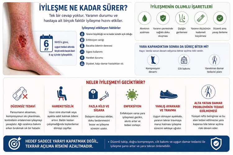 NHS, uygun tedavi altında birçok venöz bacak ülserinin 6 ay içinde iyileşebildiğini belirtir. Ama bu bilgi her hastada aynı zaman çizelgesinin işleyeceği anlamına gelmez. Bazı yaralar daha hızlı kapanır, bazıları ise daha uzun ve sabırlı bir takip ister.