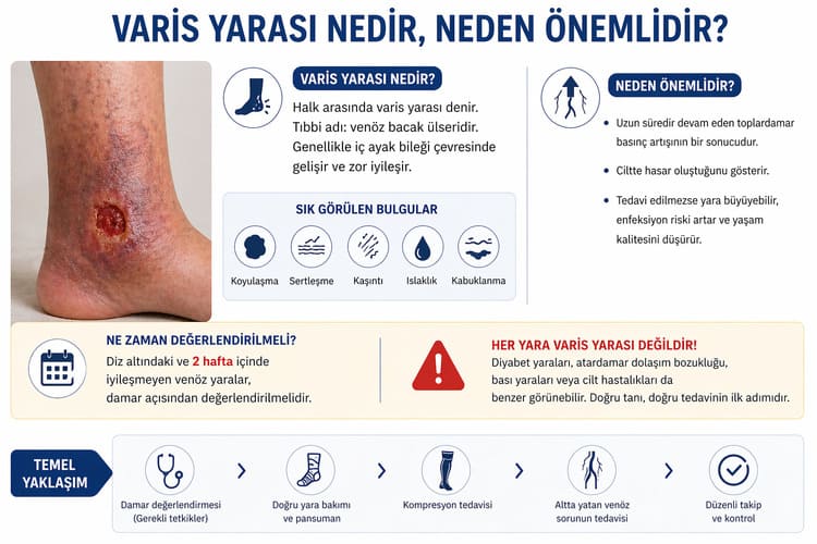 Halk arasında varis yarası denen durumun tıbbi adı genellikle venöz bacak ülseridir. Bu, çoğu zaman diz ile ayak bileği arasında, özellikle de iç ayak bileği çevresinde gelişen ve kolay kapanmayan açık yarayı tarif eder. Çevresinde koyulaşma, sertleşme, kaşıntı, ıslaklık ya da kabuklanma görülebilir.